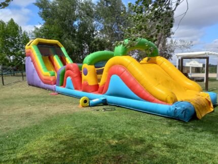 El inflable Madrid Extreme ofrece pura diversión con su colorido diseño. Con un recorrido lleno de obstáculos y toboganes, invita a jugar, competir y disfrutar al máximo cada momento.
