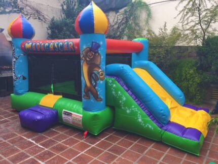El inflable Madagascar invita a vivir una aventura salvaje con colores vibrantes y un divertido tobogán. Ideal para que los niños disfruten, jueguen y se diviertan en grande.